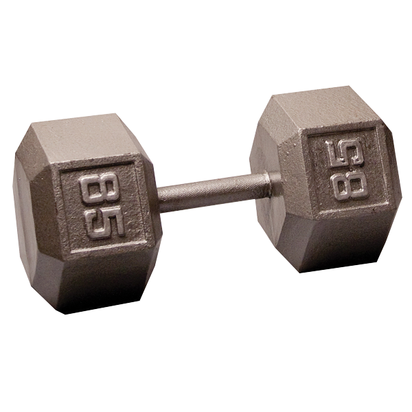 Heads are cast completely around and through two high carbon Roll Pins permanently embedded in the steel handles. No matter how much they're abused, they won't break. Specially designed hexagonal shape prevents rolling and assures safer workouts. Raised silver numbers for easy readability and quick selection. All edges and corners are ground smooth for safe handling. Cast from ASTM grade 20, the highest quality gray iron casting available. 15 to 100 lb. dumbbells feature extra-thick, stress proof, knurled steel alloy handles.